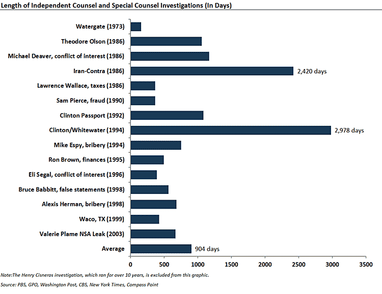 The total cost for Ken Starr's probes of Whitewater and Lewinsky, which lasted four and a half years, is put at $39.2 million, or around $58 million in today's dollars. Prior to Starr's involvement, special counsel Robert Fiske Jr. spent $6 million, the equivalent of $8.9 million today.